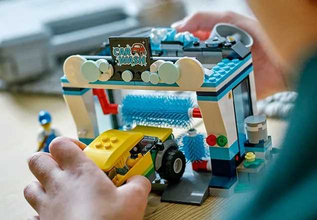 ➡️Dzieci mogą przejechać samochodem przez myjnię samochodową, aby obracać szczotkami, dozować mydliny z elementów LEGO® i ustawiać ruchome wentylatory suszące