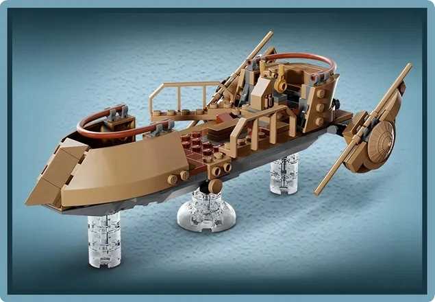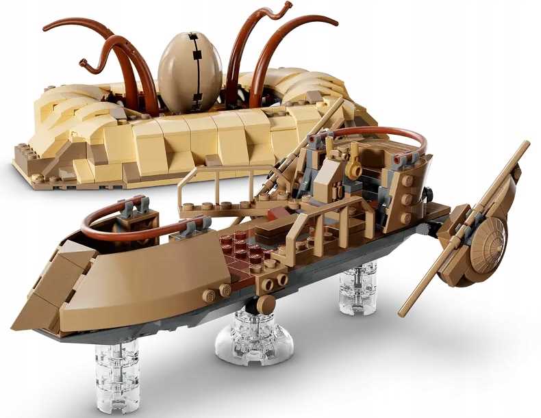 ✅Pustynna barka ma przezroczyste elementy, dzięki którym można uzyskać efekt unoszenia się w powietrzu, oraz fajne detale, takie jak wysuwana deska, po której może chodzić Luke Skywalker, oraz rozkładana poręcz, z której Han Solo omal nie spadł.