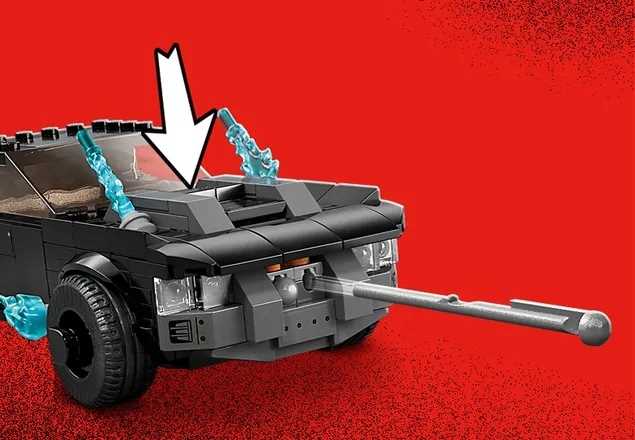 ✅Batmobil jest gotowy do walki dzięki dwóm działkom sprężynowym, które po naciśnięciu płytek na masce wystrzeliwują z przodu auta dwa ogromne pociski (równocześnie lub po kolei).