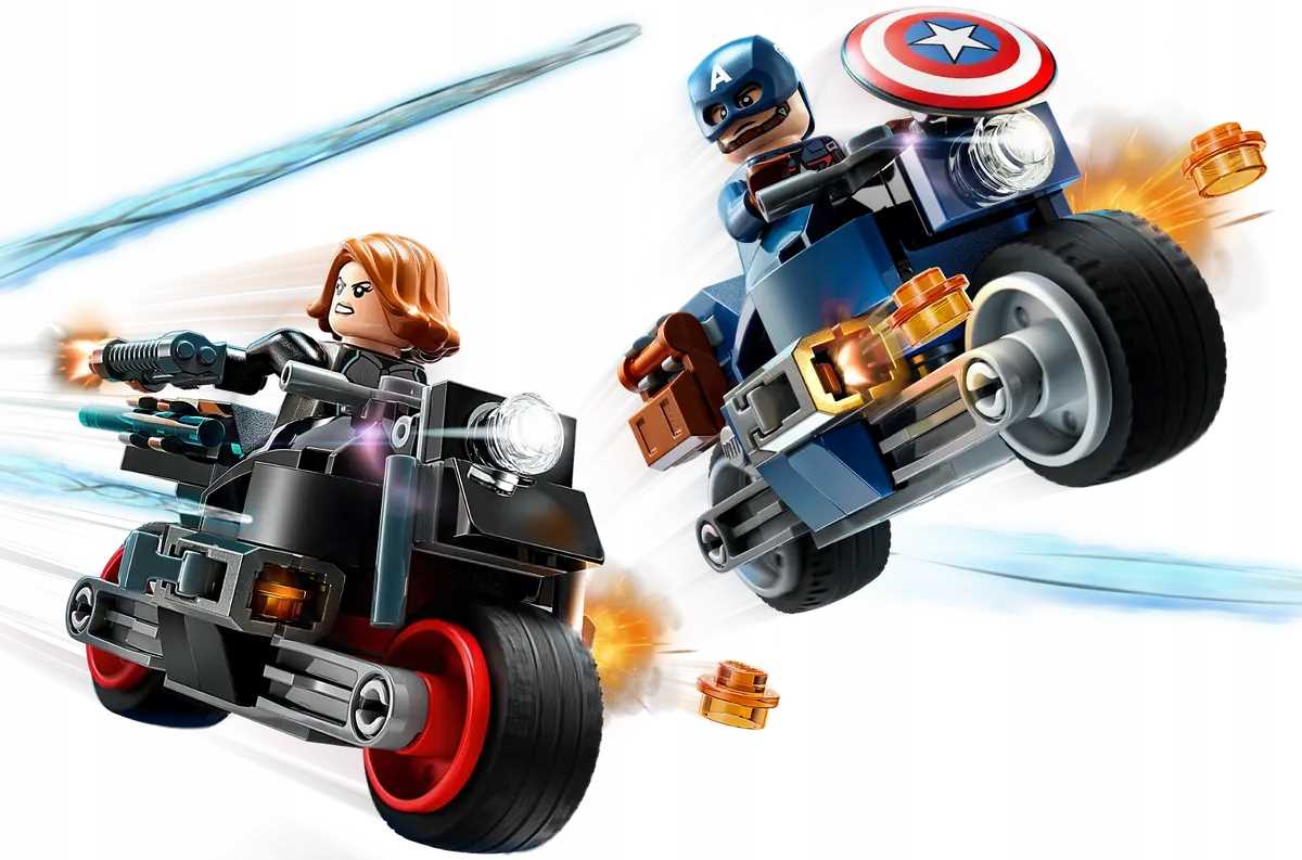 ➡️Zestaw zawiera minifigurki Kapitana Ameryki i Czarnej Wdowy z tarczą i pałką, a także dwa motocykle do zbudowania
