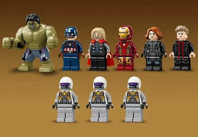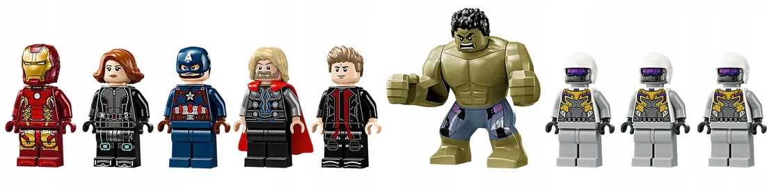 ✅Zestaw odtwarza scenę wielkiej bitwy z hitowego filmu Avengers: Czas Ultrona Marvela. Obejmuje pięć minifigurek Avengersów — Hawkeye’a, Czarnej Wdowy, Kapitana Ameryki, Iron Mana i Thora— dużą figurkę Hulka oraz trzy minifigurki żołnierzy Hydry.