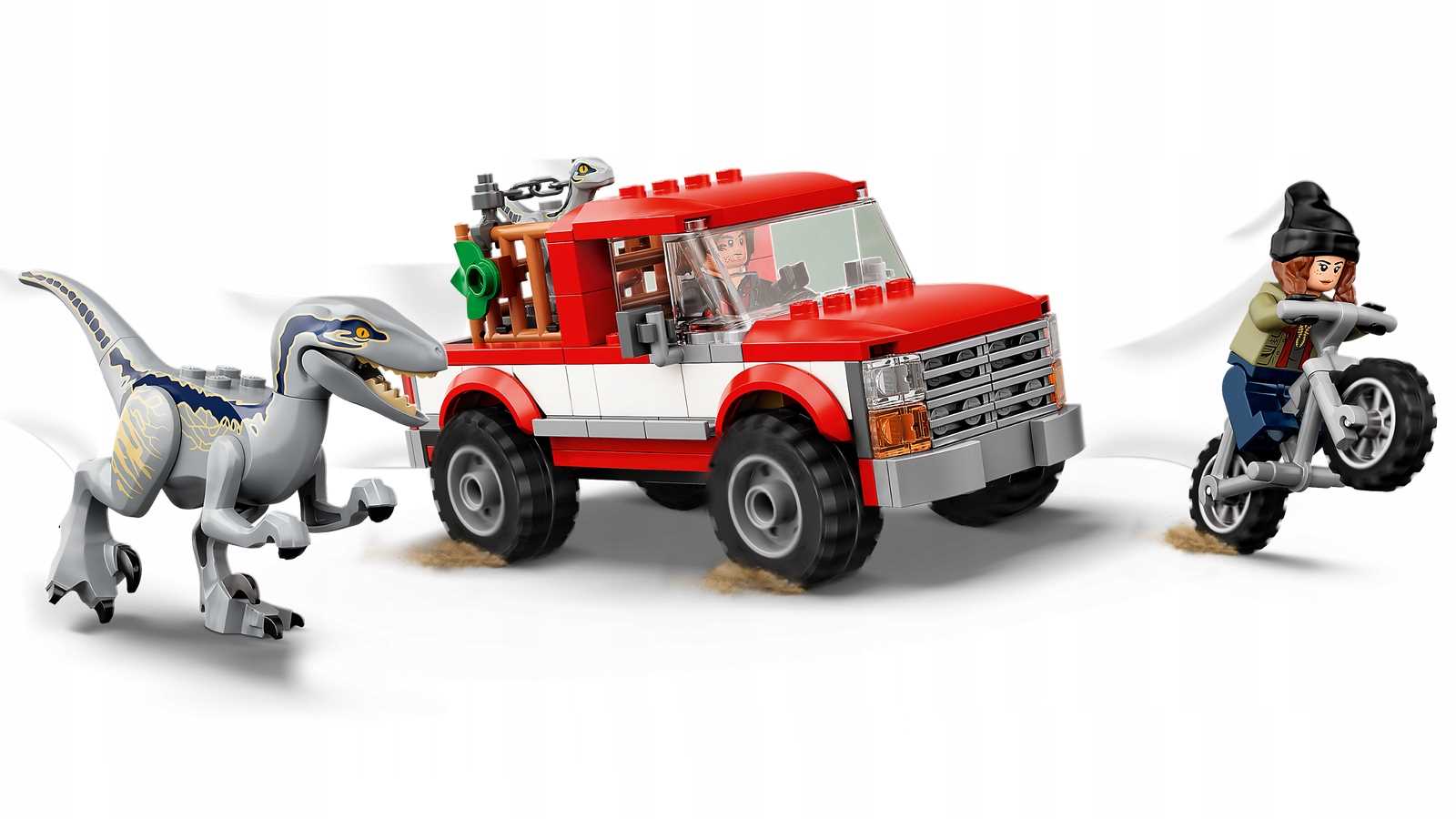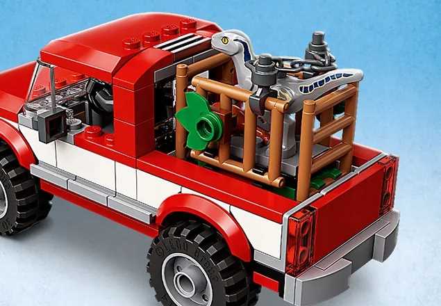 Ten 181-elementowy zestaw zawiera furgonetkę, klatkę i zabawkowy motocykl, a także 2 minifigurki i 2 dinozaury.